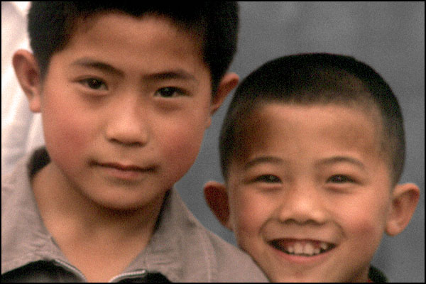 | These two boys were in a group of children who gathered around the bus in which I, various VIPs and dancers of the Boston Ballet were on our way to a reception and demonstration at the Beijing Dance Academy. I had taken a polaroid photo of them and handed it to them through the windowhence their expressions of interest and delight. Six photos of the demonstration can be viewed beginning here.