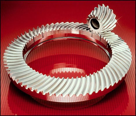 This is a spiral bevel gear, manufactured and chrome plated by the Amarillo Gear Company. The large circular ring is about 30" in diamter. This was used as a cover shot for a promotional brochure. The original was shot on 8"x10" color transparency film and has not been retouched, nor have any special effects been added in Photoshop--the image predates Photoshop. Everything you see was done in-camera using a multiple exposure technique. |