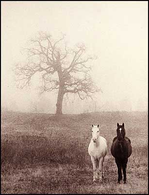 These two horses had been standing beneath the tree in the background when I called to them from the barbed wire fence that ran along the highway near Bastrop, Texas, one foggy morning. They approached me, out of curiosity, it seemed, then posed for this photo. |